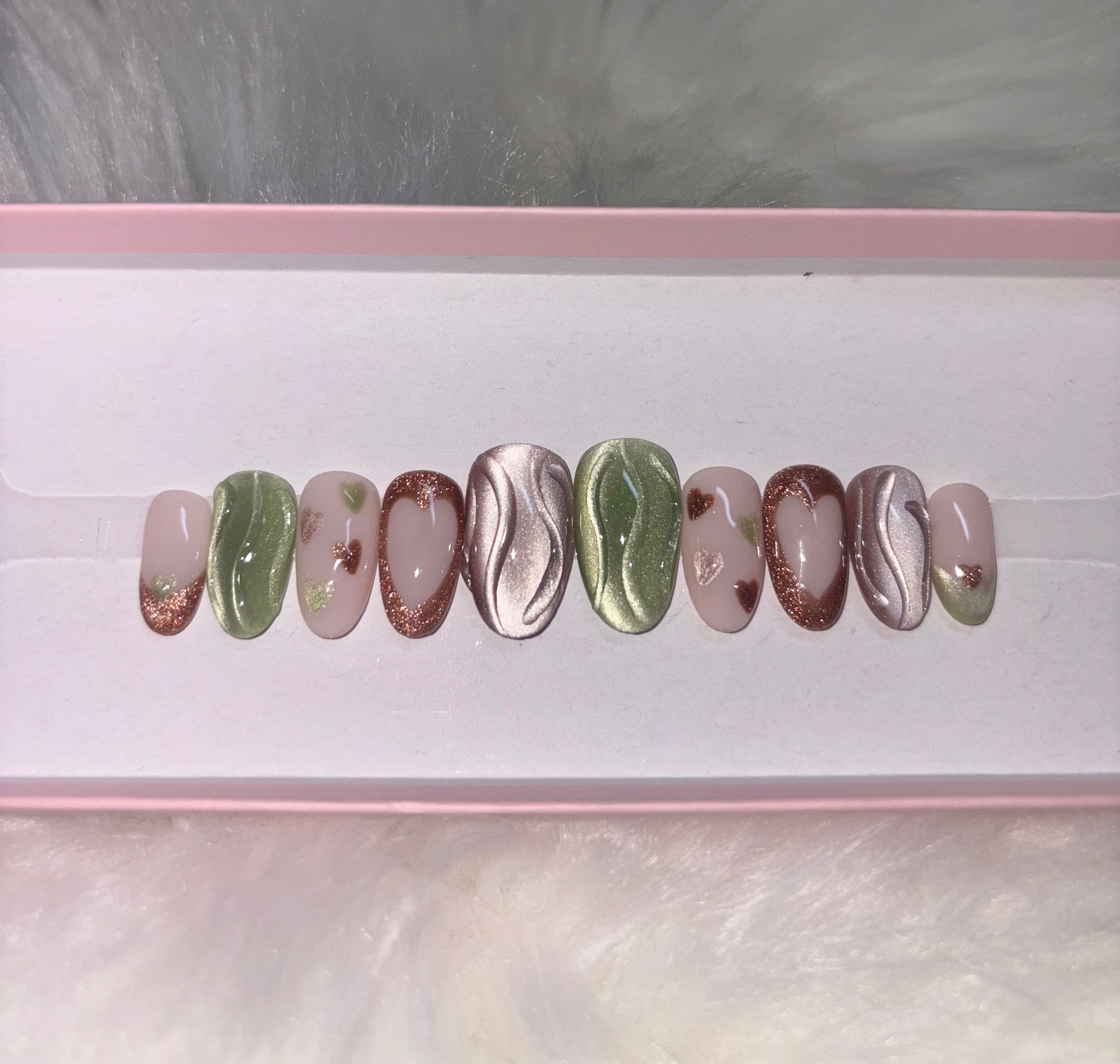 ALT Text: green brown cat eye velvet fall 3d swirl hearts earthy valentines day