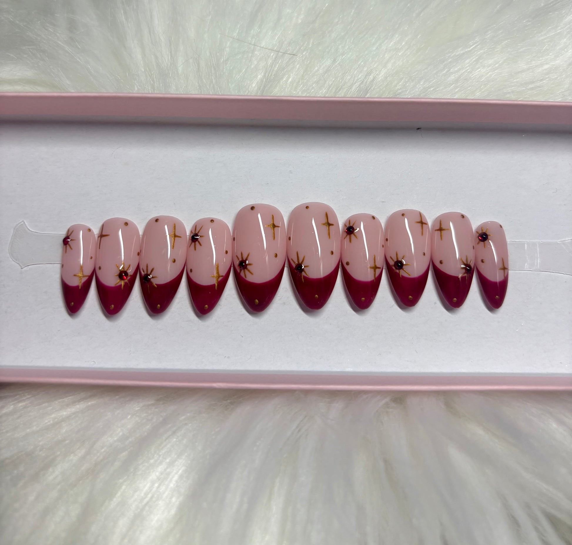 ALT Text: dark red maroon burgundy fall french tips gold stars fall