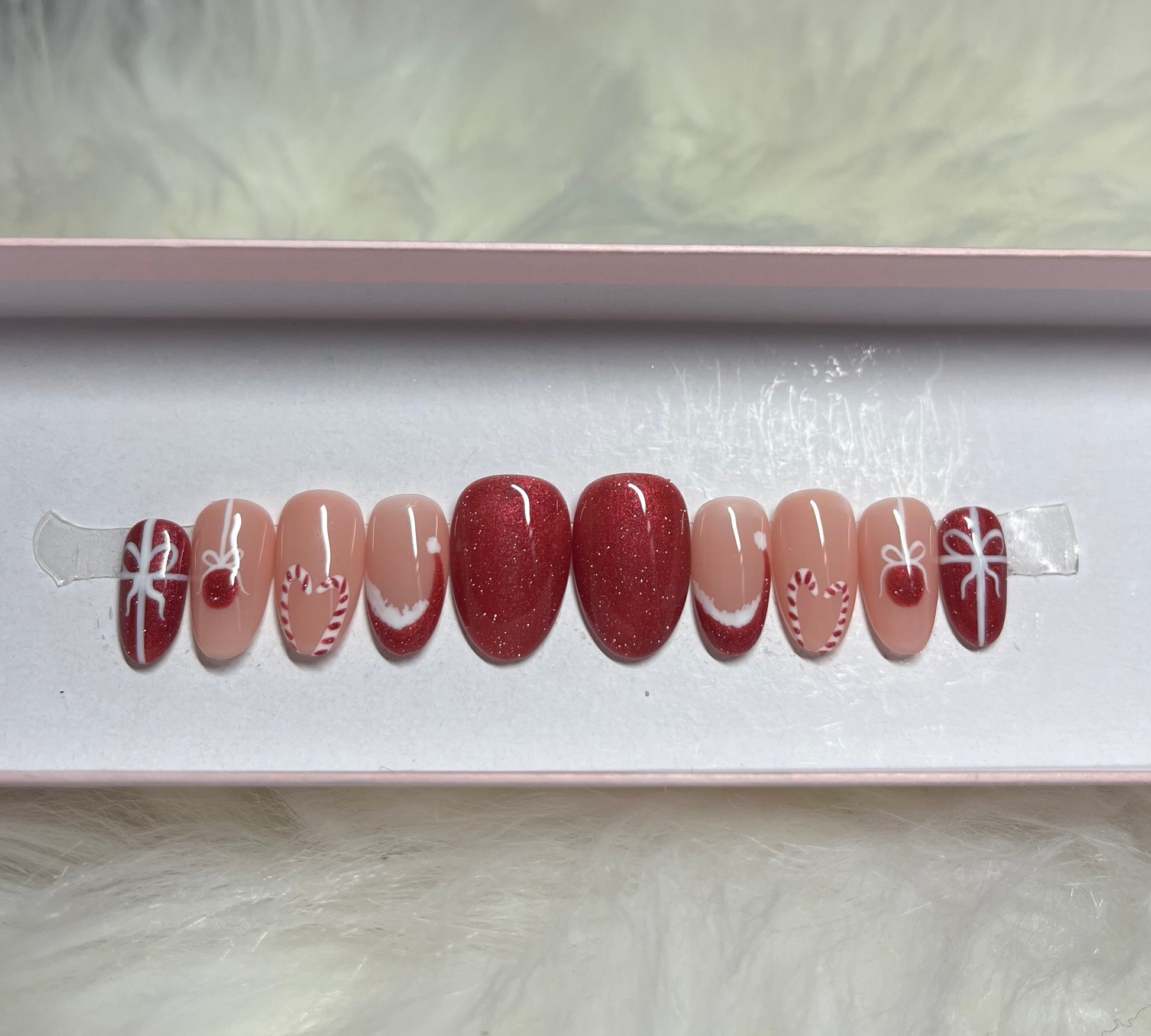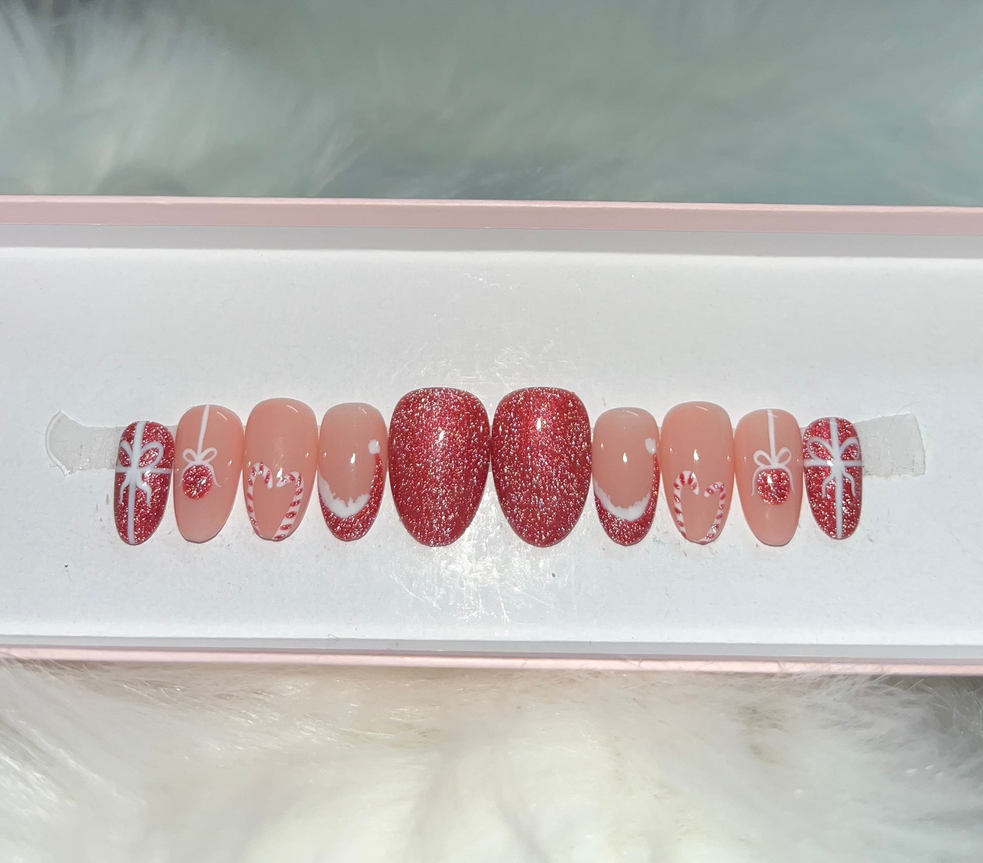 ALT Text: red glitter flash candy cane heart santa hat ornament bow ribbon holiday christmas