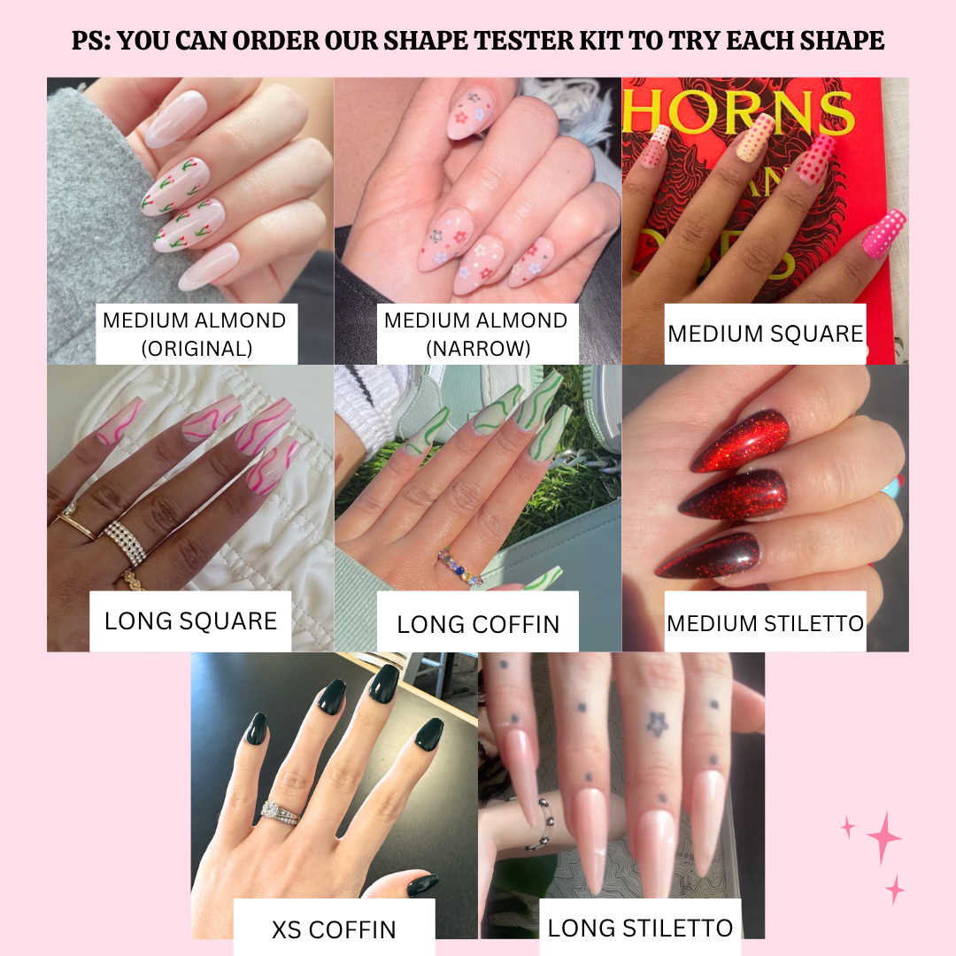 The shape shown in the photo is "Short Almond (Original)". If "Custom" sizing has been chosen, please leave your sizes in the note to seller section before checking out.