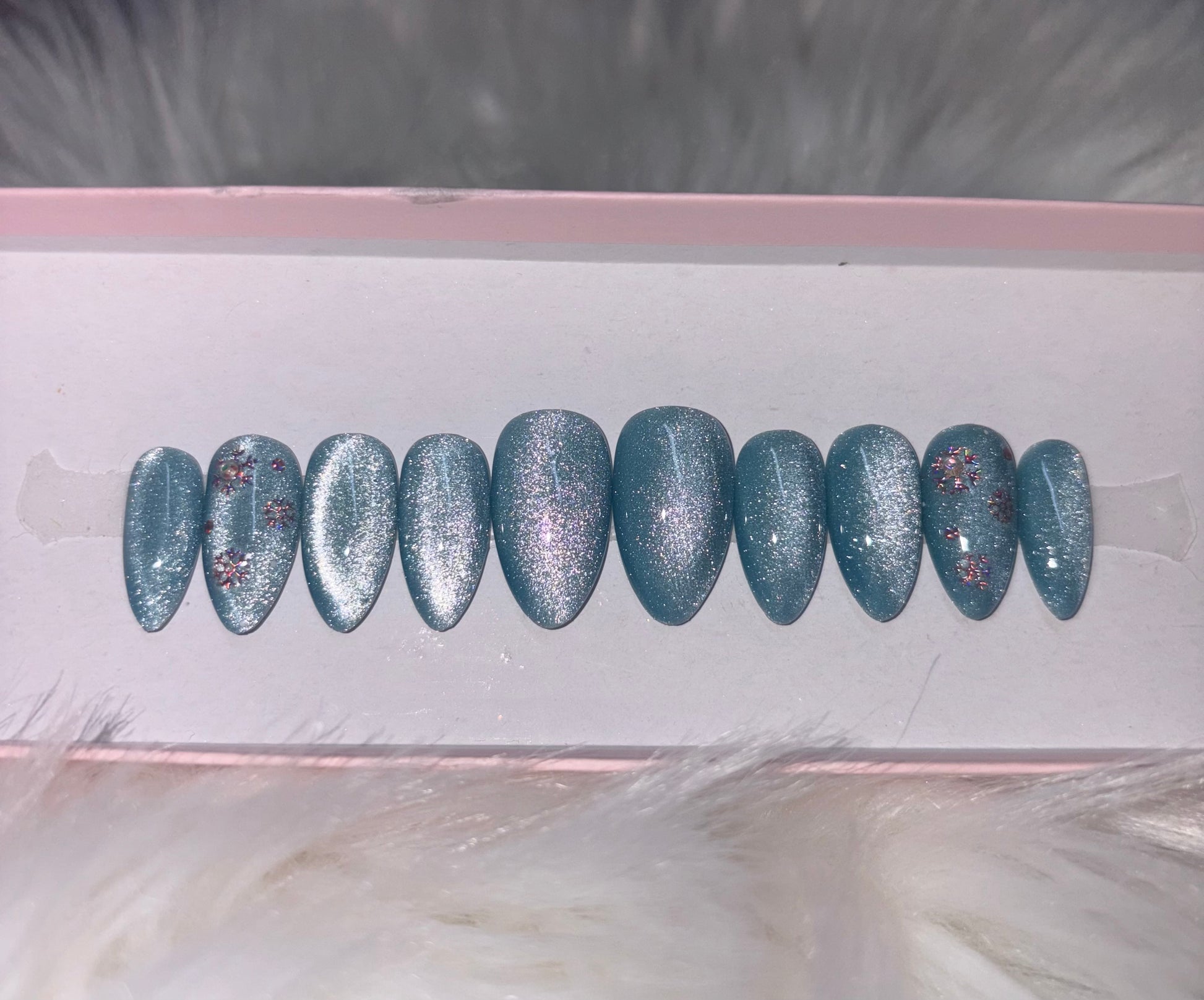 ALT Text: blue icy winter cat eye silver snowflakes christmas holidays