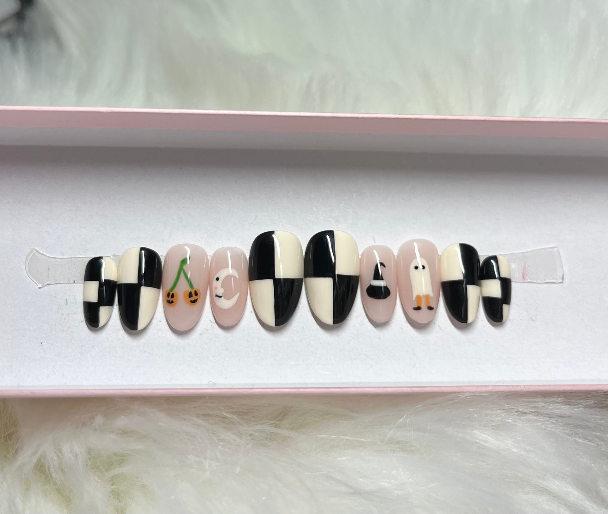 ALT Text: pumpkin jack o lantern cherries, checkers, witch hat, ghost, halloween