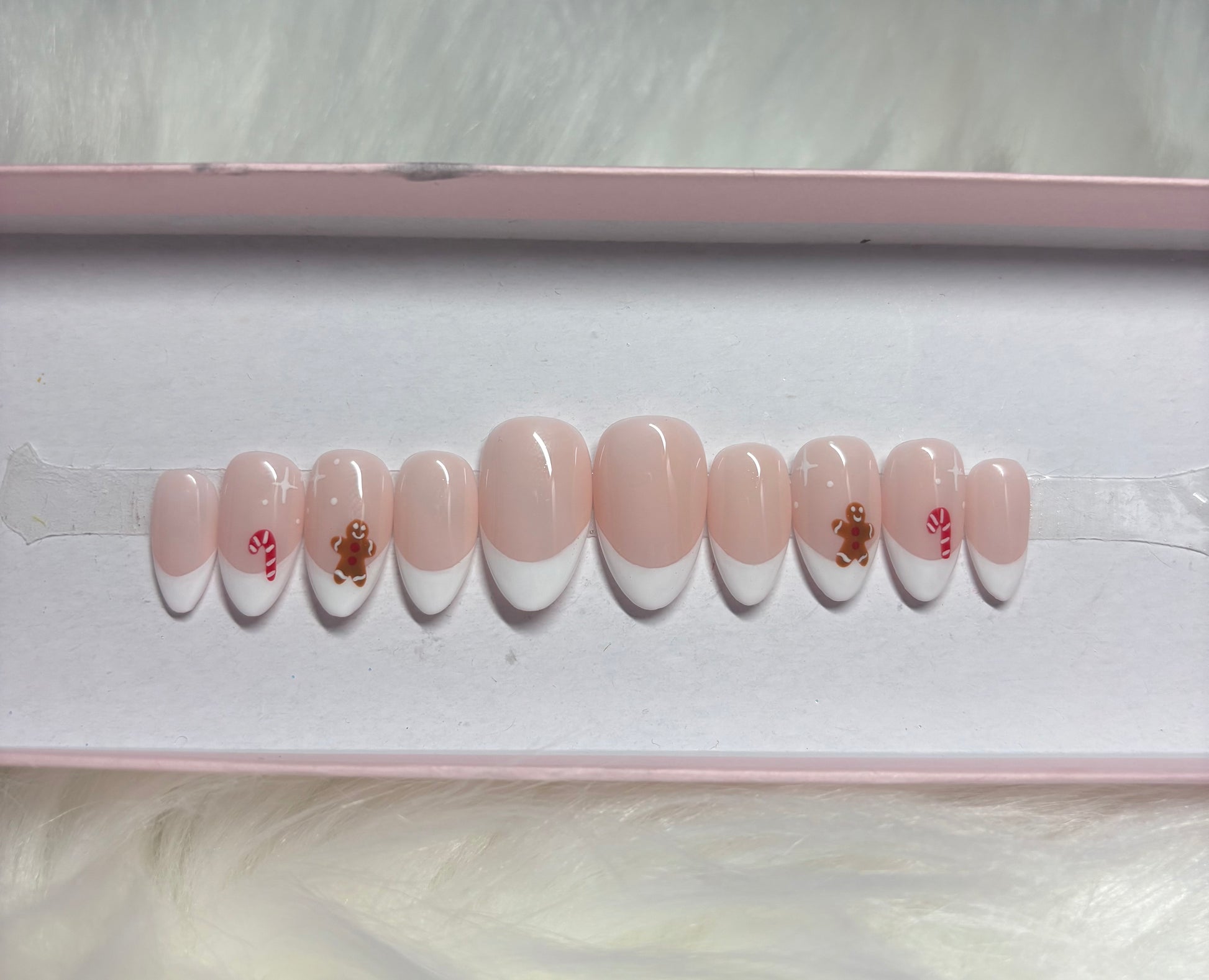 ALT Text: white french tips neutral gingerbread candy cane christmas holiday