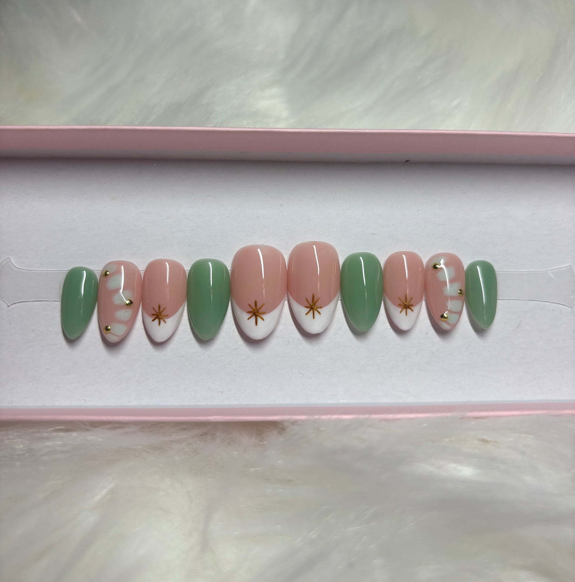 ALT Text: green sage white french tips gold stars blooming gel fall earthy