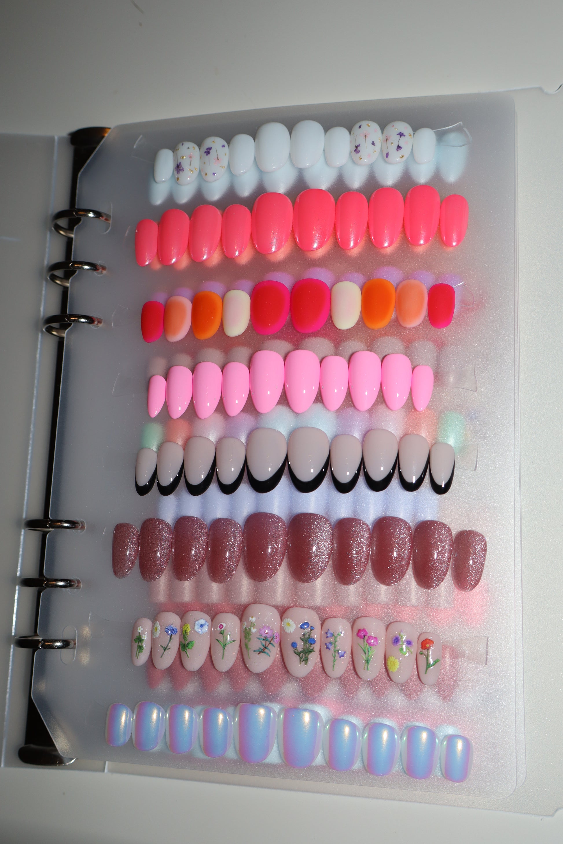 Introducing the Nail Book: a binder that holds up to 126 short-medium length press on nail sets. Comes with sticky adhesives.