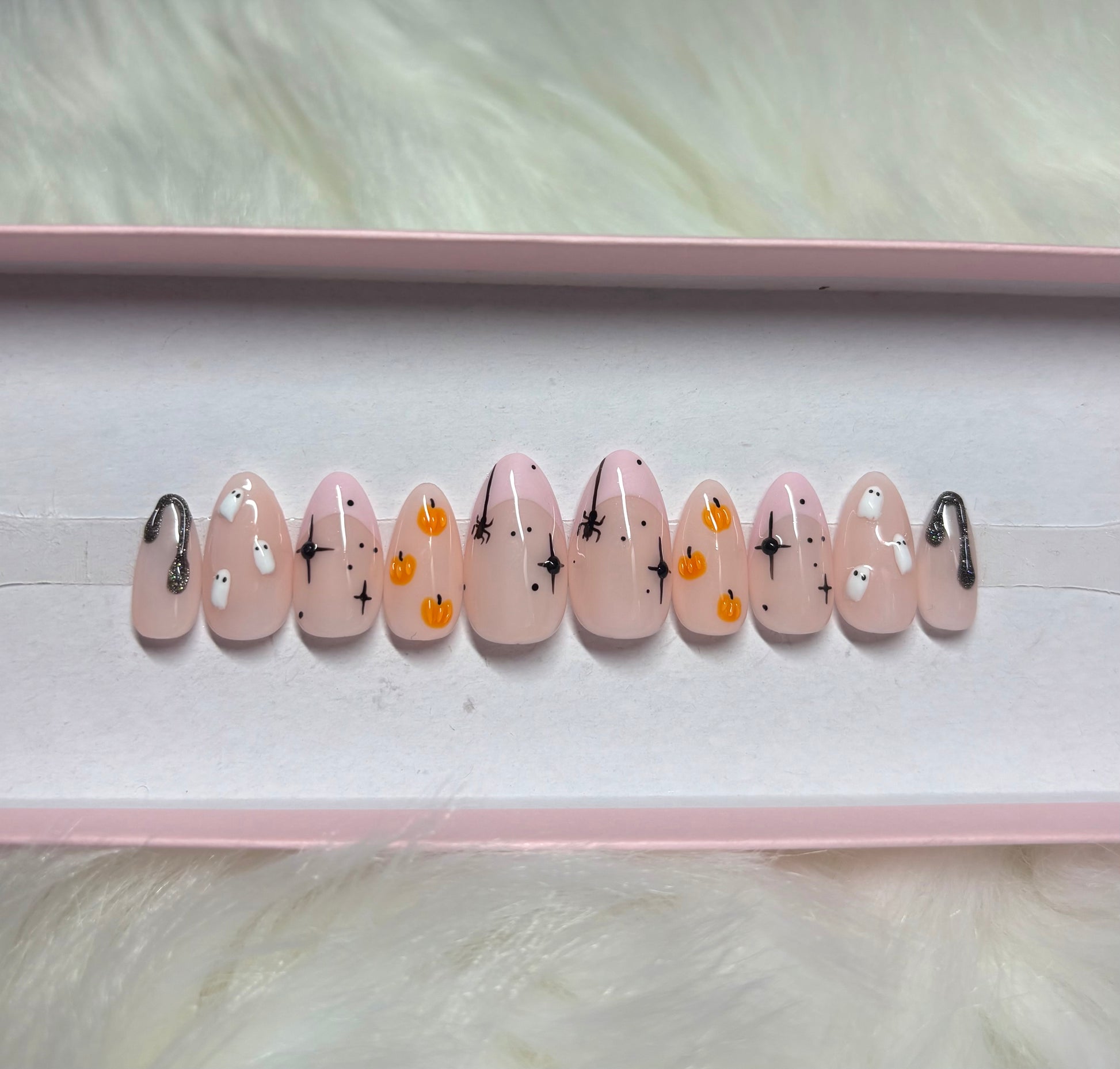 ALT Text: pink french tips black stars halloween spooky 3d pumpkins ghosts black blood drips