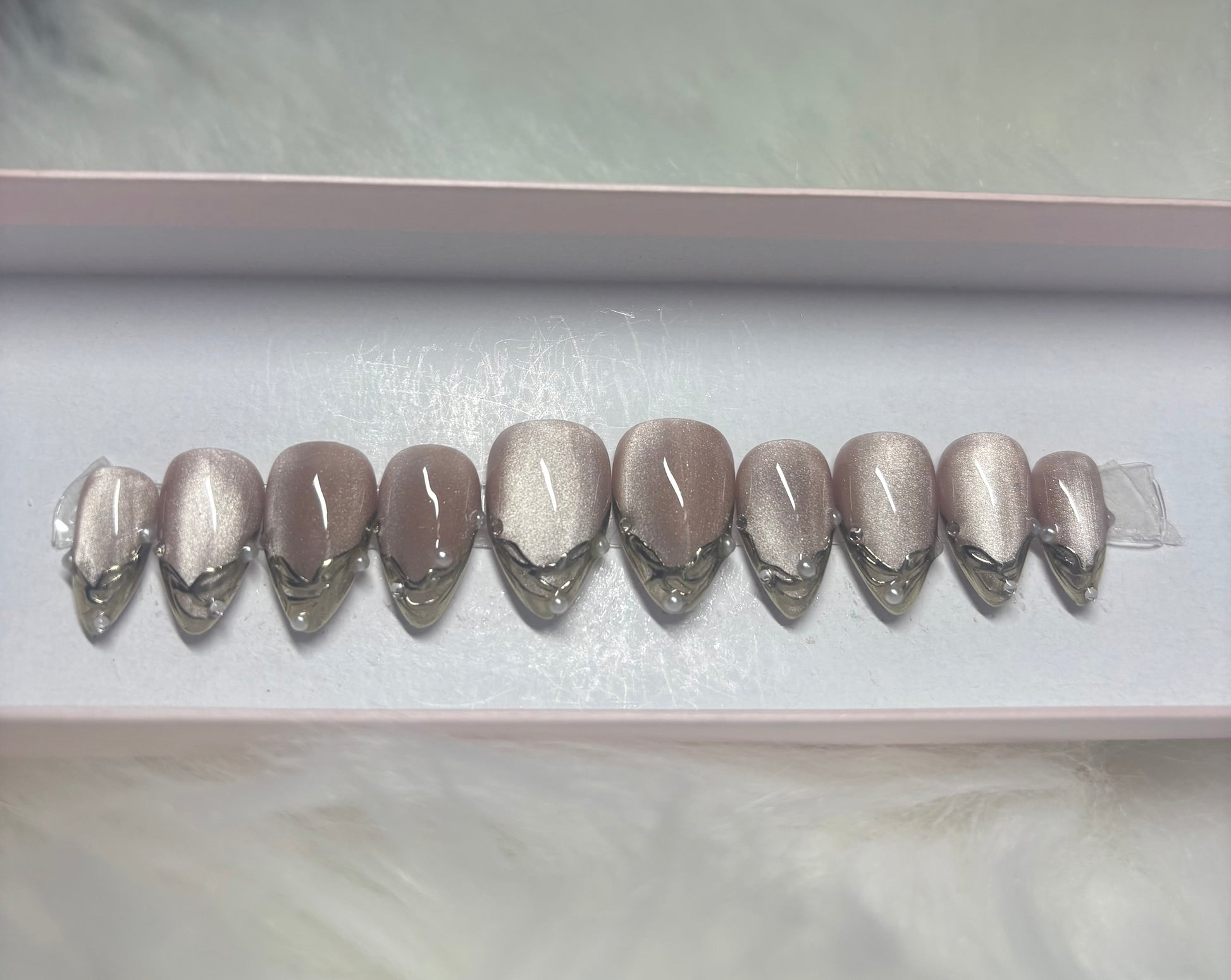 ALT Text: brown cat eye beige nude neutral gold 3d pearl gems