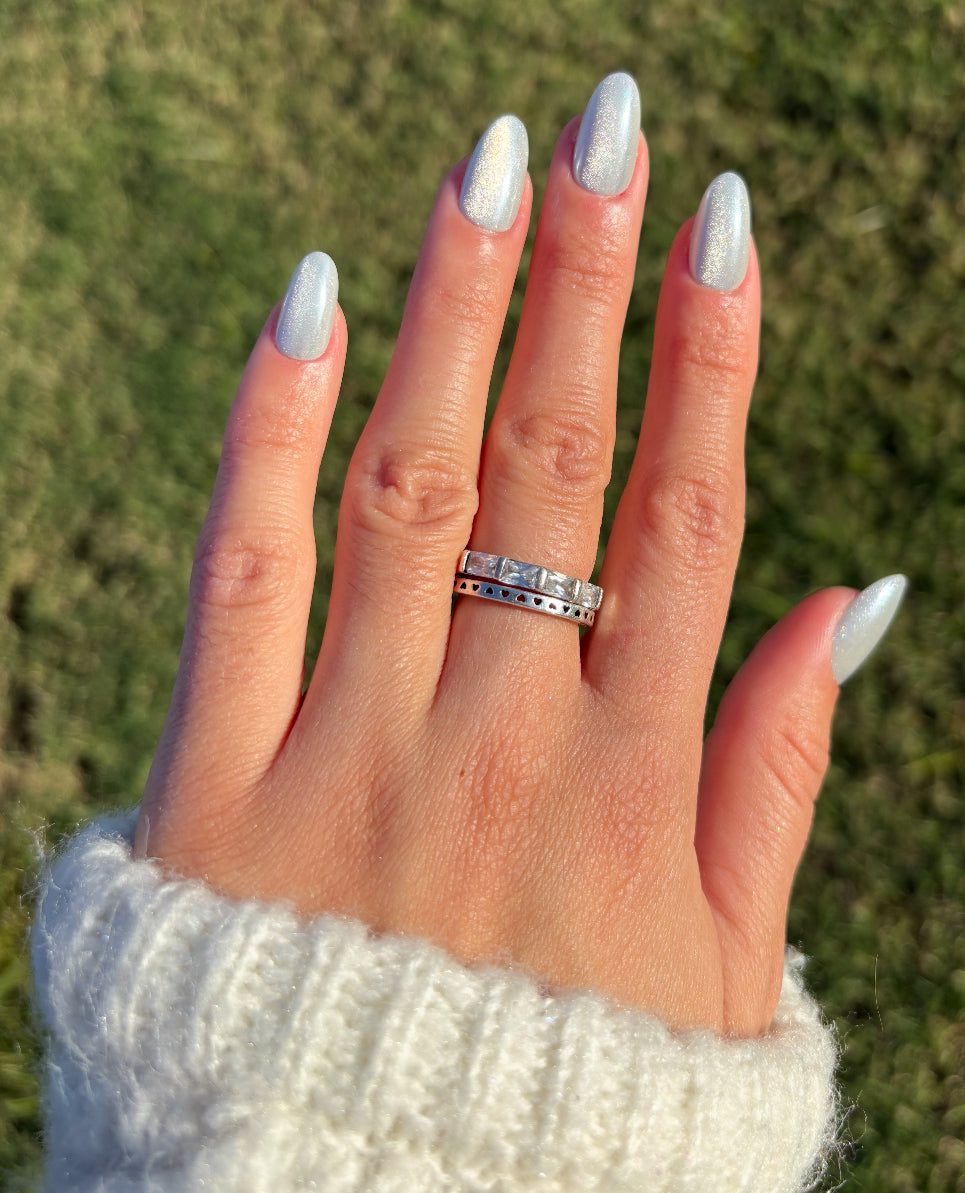 ALT Text: silver cat eye chrome holiday christmas new years eve NYE