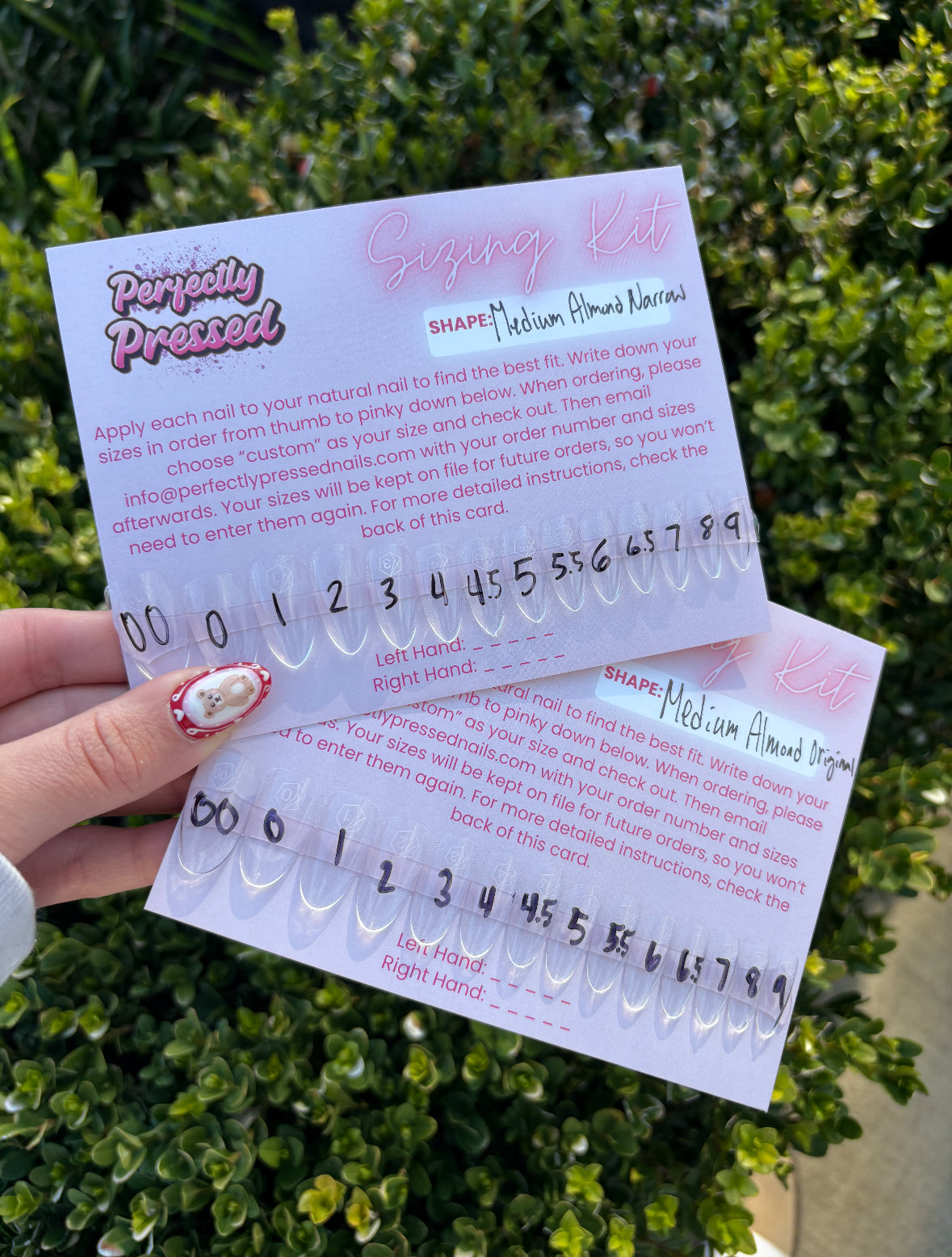 Simply try on each nail, write down your sizes, and place your order. On your first purchase, you’ll email us your sizes and we’ll keep them on file for all future orders.