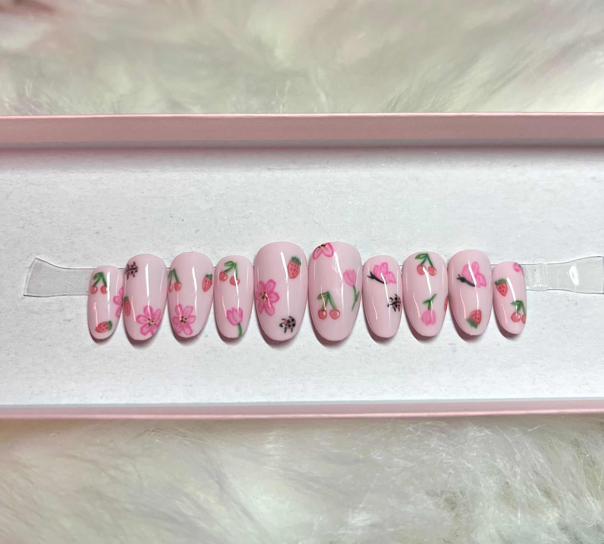 ALT Text: light pink pastel butterfly fruit strawberry cherry flowers floral tulips