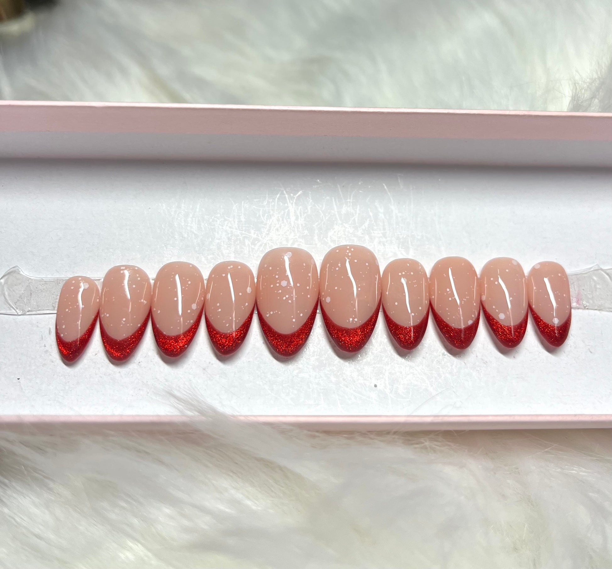 ALT Text: red cat eye holidays christmas snow glitter french tips