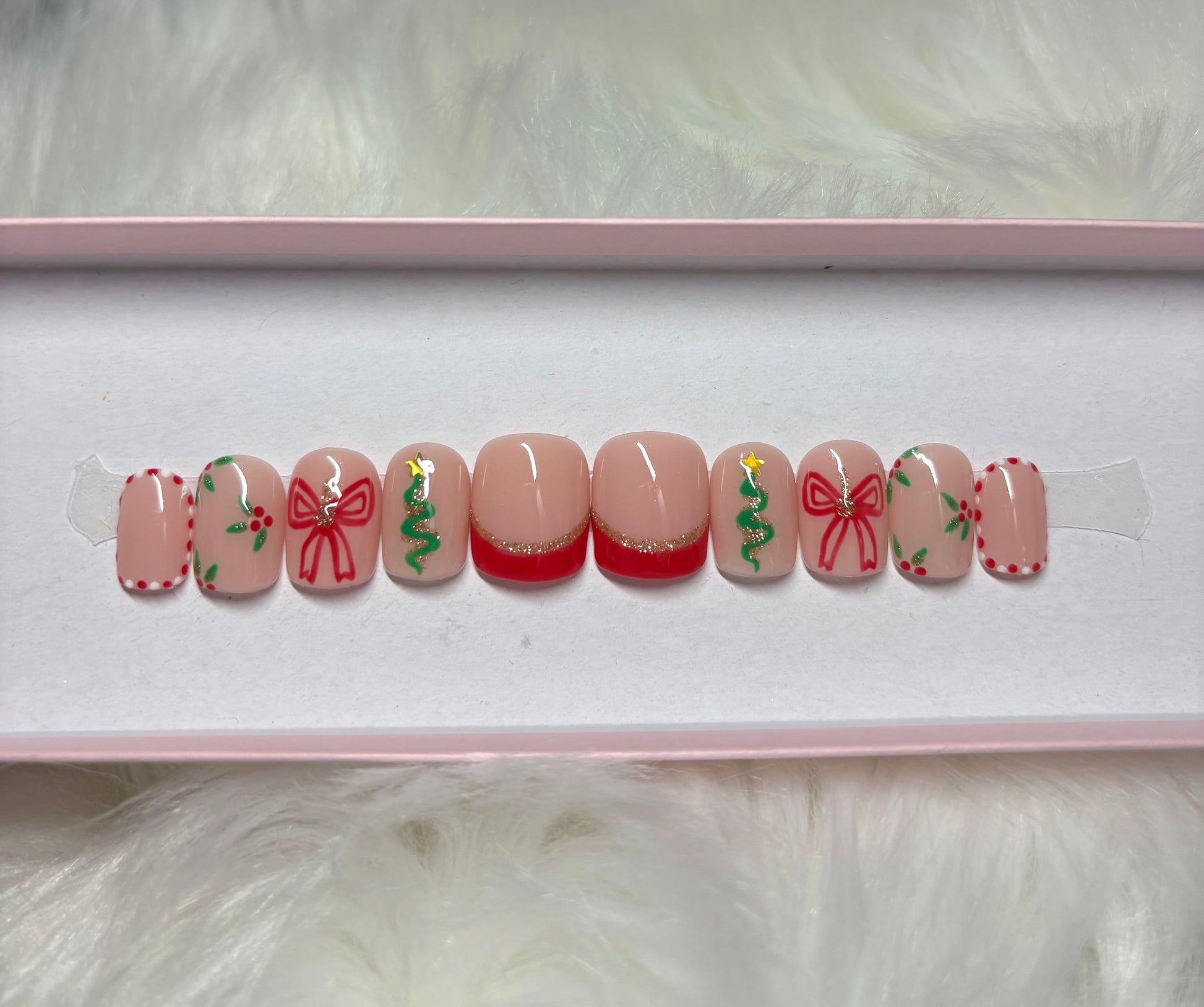 ALT Text: christmas holiday red green gold bow mistletoe tree